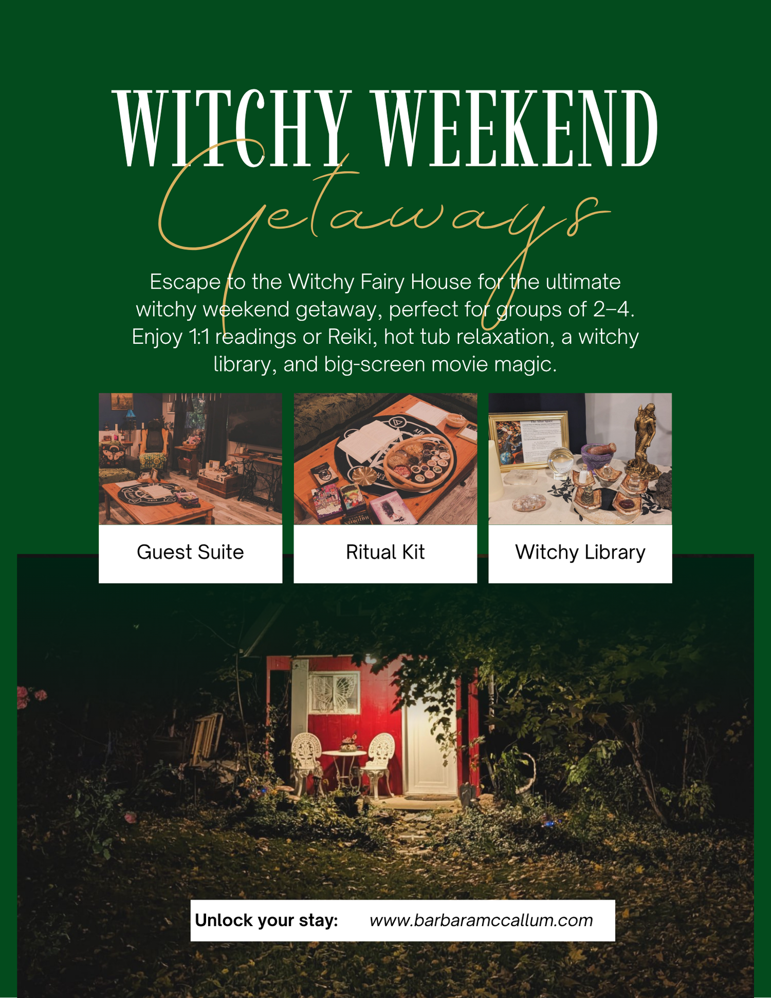 Gather your friends (or come solo) for a rejuvenating witchy weekend featuring private readings, soothing reiki, hot tub time, and a space designed for connection and magic.