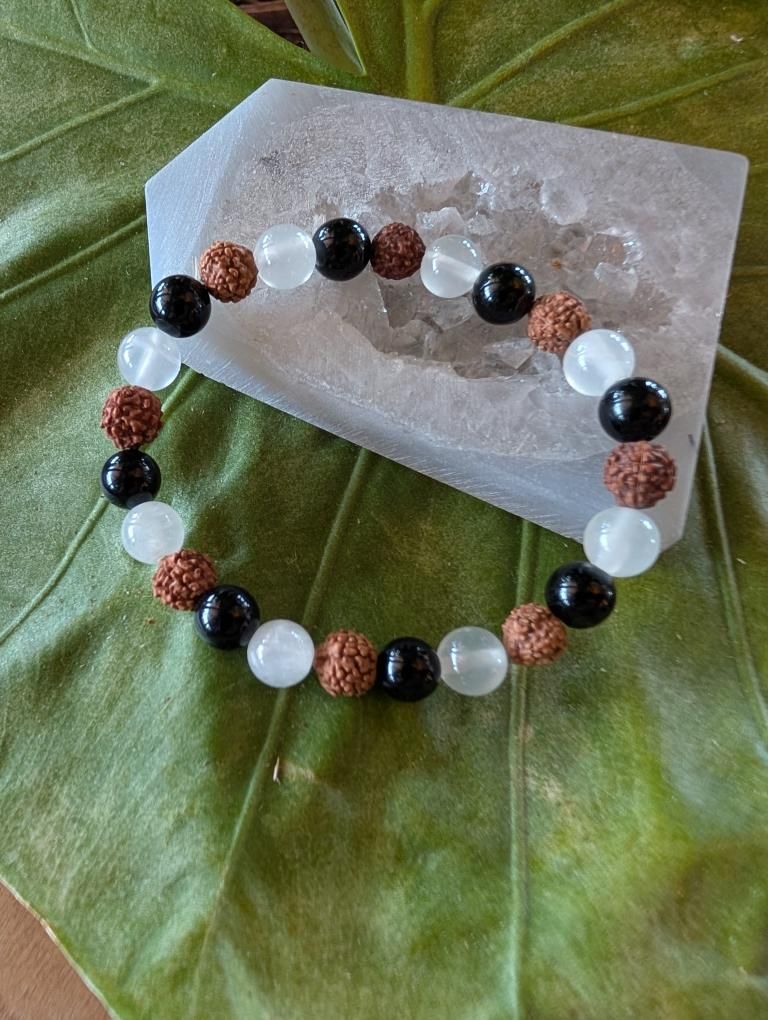 A powerful blend for spiritual grounding and clarity. Rudraksha beads are traditionally used in meditation for protection and focus, quartz amplifies intention, and obsidian provides grounding and energetic shielding.